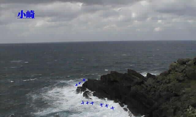 | 道路から小崎先端まで5〜6分 この当たりは全てがポイントといってもよく、その日の潮の向き、サ ラシの出具合で、釣り座を決めれば良い。凪の良い日は、写真正面 で半分隠れている岩の先端から右前方に浮きが流れる日に大釣り する事がある。浮き下は2ヒロ半から4ヒロ位、餌オキアミ、ボケ。 |