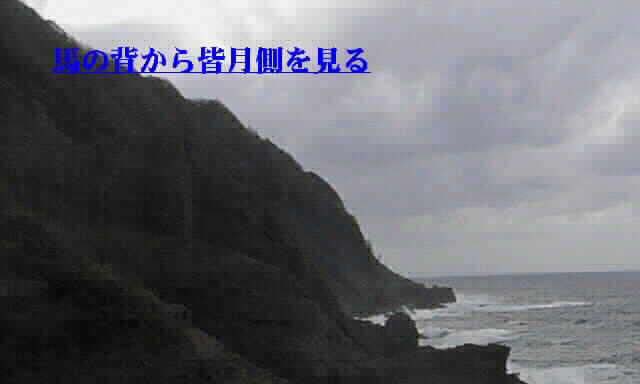 | 馬の背から皆月方面を見ると、一番奥に見えるのがノコギリ岩で、その手前にチラッと見えるのが大長崎です。 荒磯遊歩道(上大沢〜皆月)の距離は 5、5km 上大沢〜馬の背は1、6km 馬の背〜大長崎は2、2kmです。 |